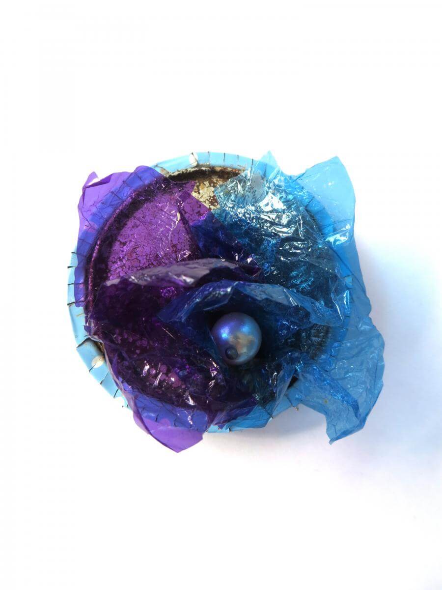 NECKPIECE / BROOCH (jar lid, rusted drinking can top, plastic sweet wrappers, reclaimed faux pearl, vintage bead necklace, vintage button, copper foil, iron, recycled silver, stainless steel)