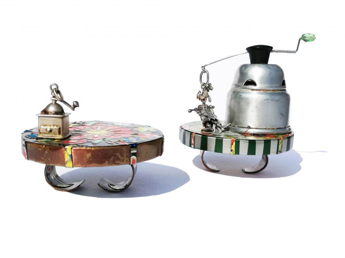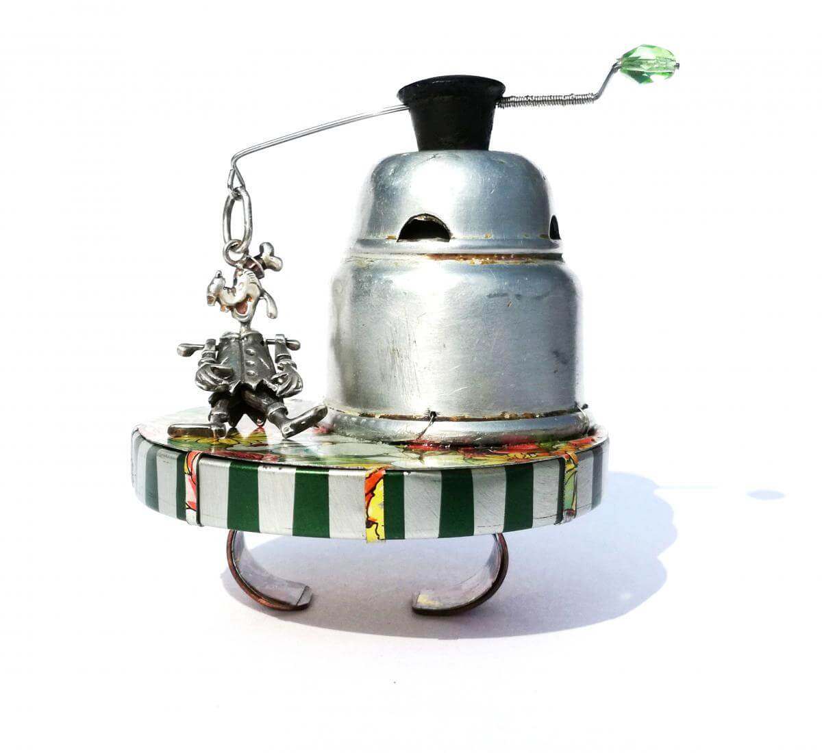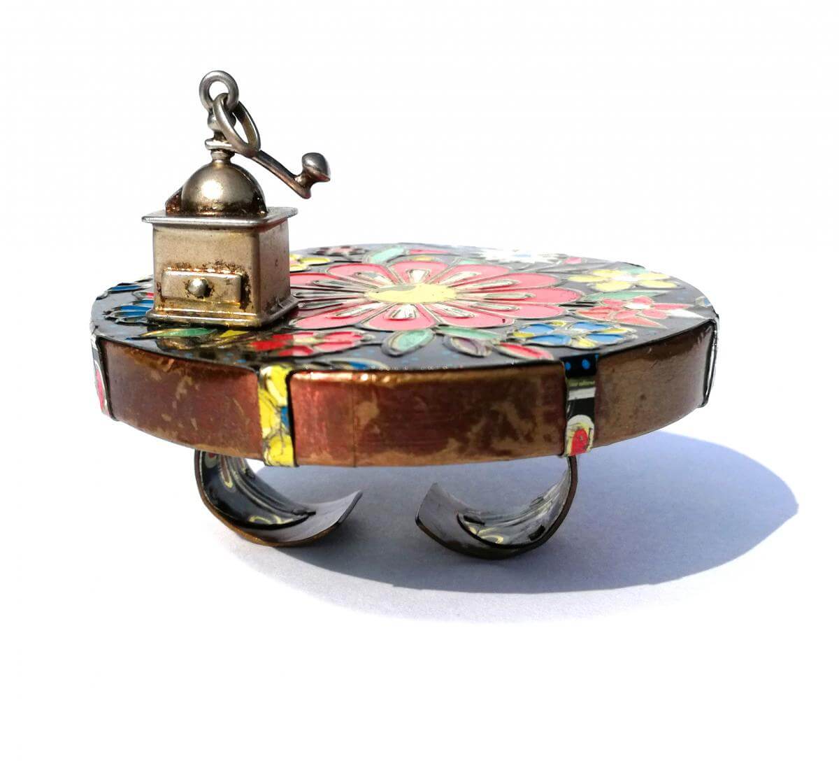 “TUTTI GIÙ PER TERRA” – RING (jar lid, old kettle whistle, silver charm, vintage tin, copper, stainless steel wire, glue, plastic bead)