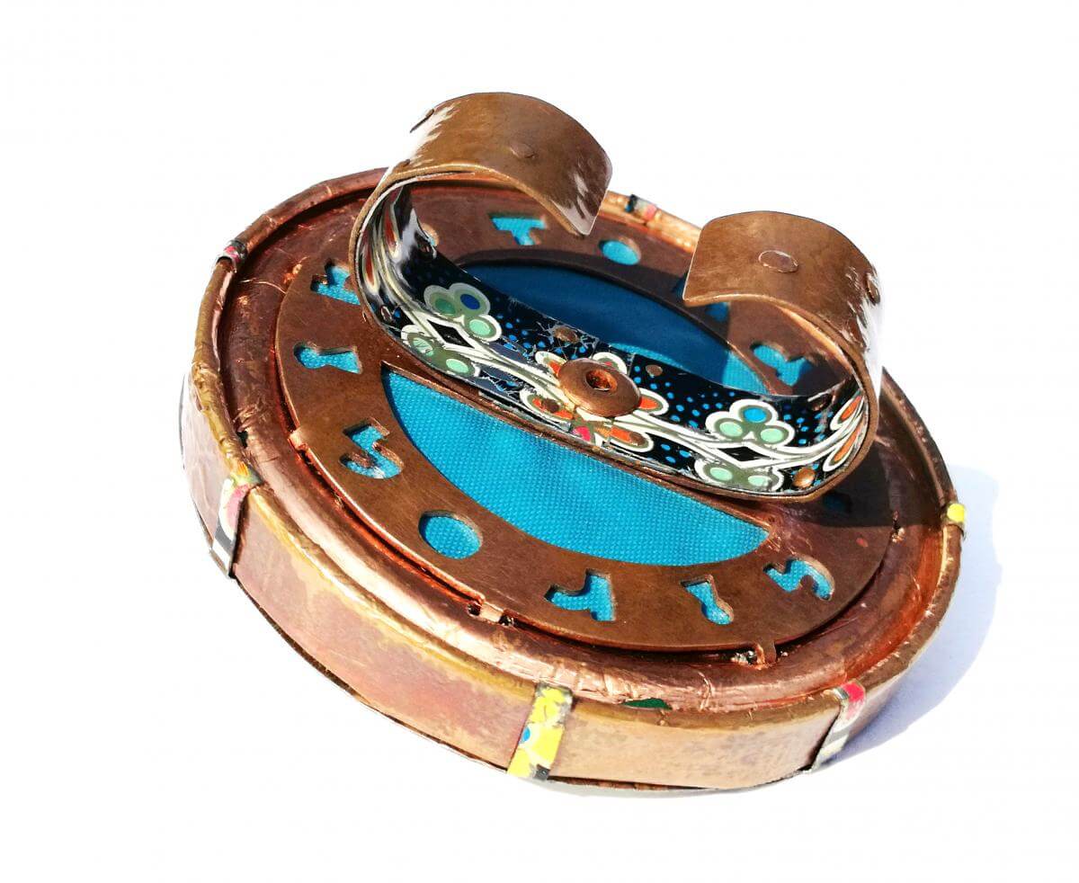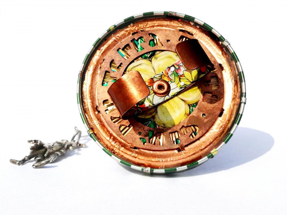 “GIROTONDO” – RING (jar lid, vintage tin, silver charm, copper sheet and adhesive, paper, glue, fabric, steel wire)