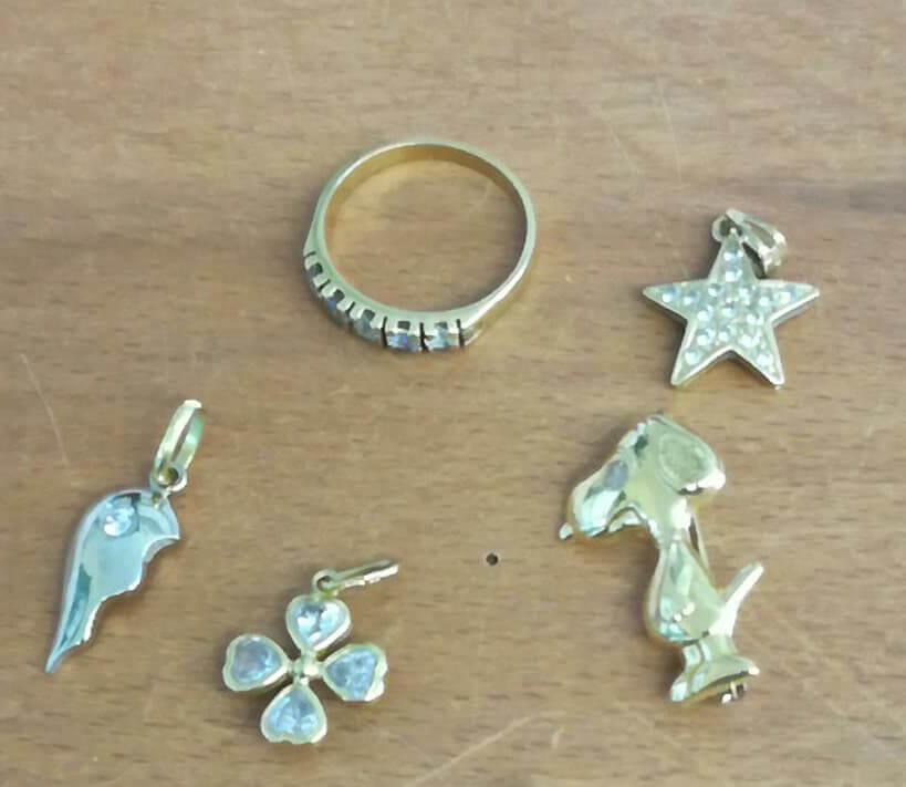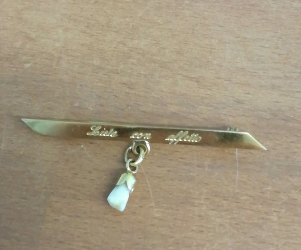 The charms chart important stages in my young life, and include gifts from my first important relationship and from very close, now-lost friends for important birthdays. The clasp is a brooch holding my first lost baby tooth, commissioned by my mother for my grandmother, who unfortunately was not the the easiest of people, and eventually returned to me at the time of her death.