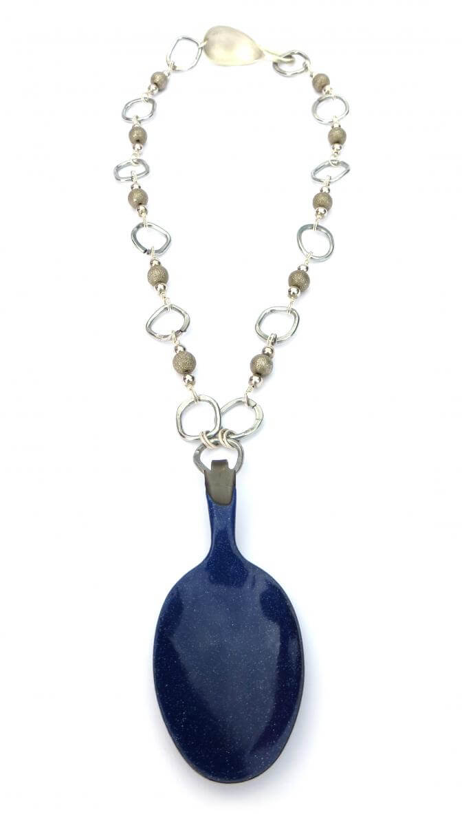 NECKLACE (spoons, enamel, reclaimed steel, reclaimed metal beads, recycled silver)