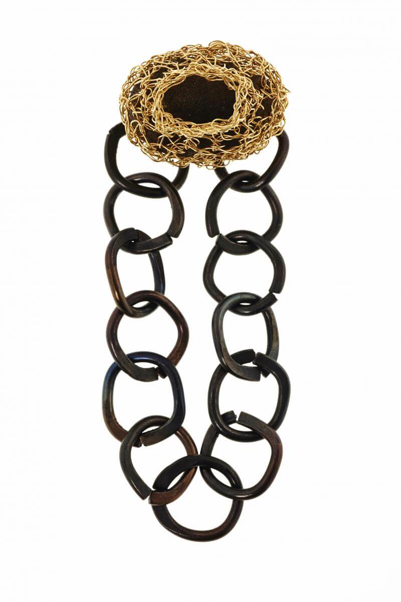 The metaphor of a humble pebble realising it is significant enough to be wrapped in gold is a simple and open one. But the fundamental element in this piece is the chain. While it appropriates a family heirloom, providing a link to our personal heritage, it can also be detached and worn on the brooch, or it can be fully removed. The key lies in our awareness and availability of this choice.