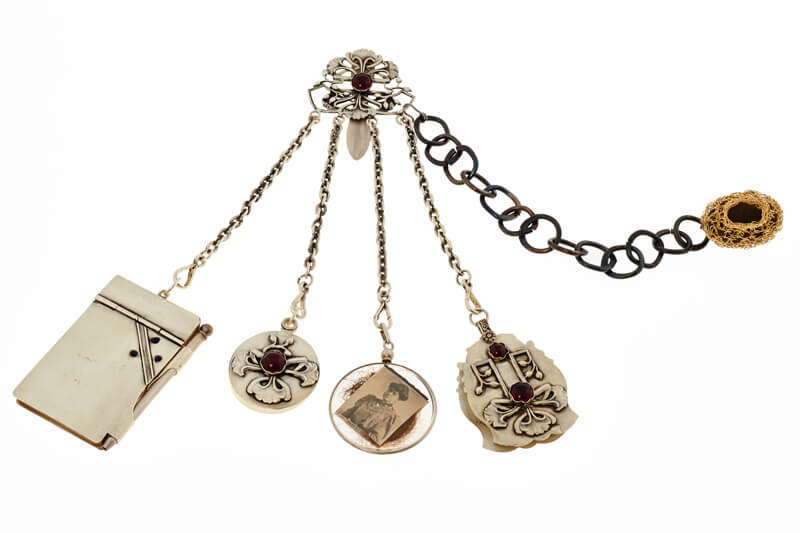 BROOCH (18ct gold, pebble, steel, silver. Linkable to inherited chatelaine)