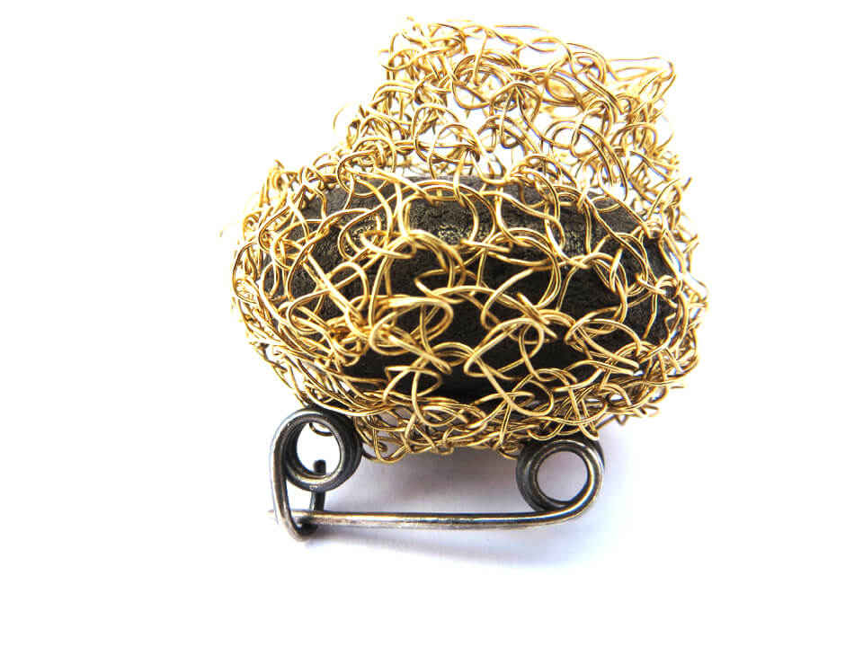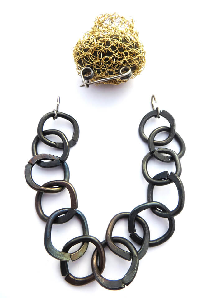 The pin itself was dictated as much by function as by cultural references. On one hand, it combines the ability to be woven through the gold crochet vessel without soldering and to provide two anchoring points for the chain. On the other, it has the look and feel of an old-fashioned safety pin – a signifier of the familiar and of mending, but also of rebellion and harm.