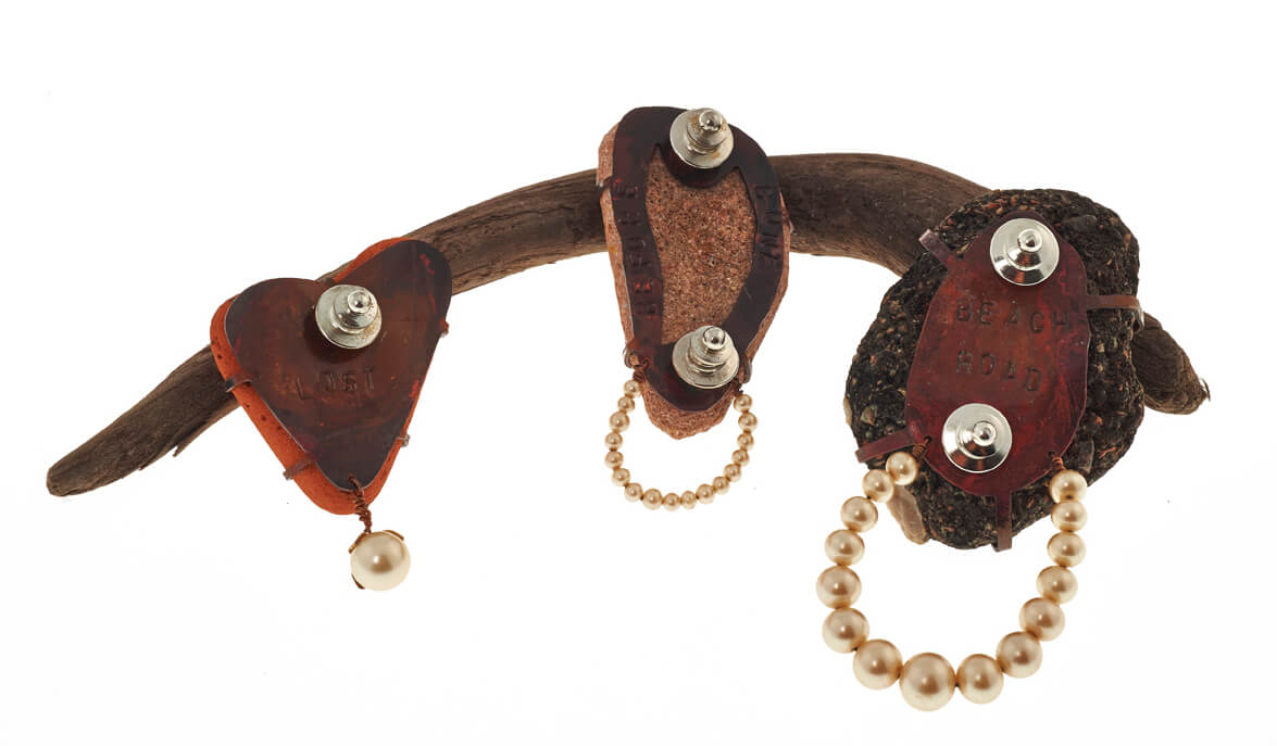 BROOCHES (copper, beach-combed building material, vintage faux pearls)